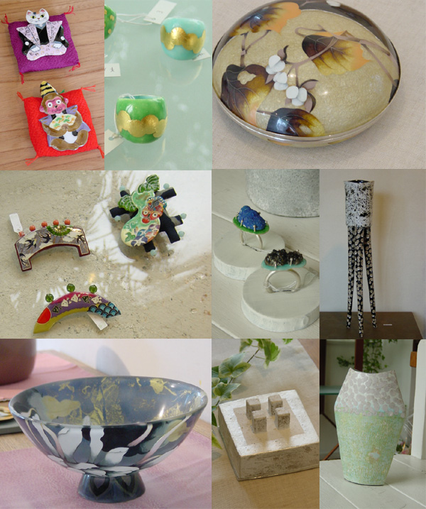 七宝焼というと、なにかとてもクラシックな(←ちょとオバチャンぽい)イメージがありますが。そんな先入観はこの展覧会に出品される作品たちがすっかり払拭してくれます。ガラスに七宝を施した伝統工芸作家・九鬼さんの器は光を吸い込むかのような輝き。美しいフォルムにマットなテクスチャーで佇む岩田さんの箱ものや江戸時代にタイムスリップしてしまったかのような、小粋で楽しい世良さんの作品は海外でも高い評価を受けています。そして七宝表現を楽しく取り込んだ若い花岡さんの指輪やブローチ。こ~んなに表現の幅があるなんて!と驚いてしまいます。