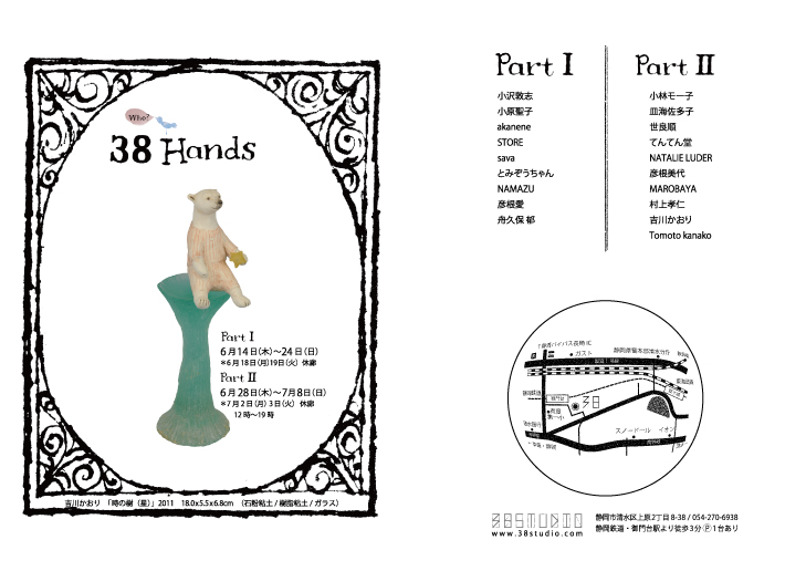 『38Hands展』 【Part1】 小沢敦志、小原聖子、akanene、STORE、 【Part2】6月28日(木)~7月8日(日) 小林モー子、皿海佐多子、世良順、てんてん堂、 毎年、年末に行ってきた19人の手による作品が一堂に会する「38Hands展」。第3回目となる今年は、昨年(2011)に私がオランダのアーティストインレジデンスで向かいのアトリエだったNatalie Luder氏(http://www.natalieluder.ch/)に、彦根愛さんのジャガード織の鮭のケース・イワシの缶詰に入ったイワシのネックレス、ドローイングをした布でバッグや洋服を作るakaneneさん、5月にボーダーTシャツで楽しませて下さったSTOREさんからは、美しいメンズシャツなど、はじめて参加してくださる作家さんの作品も楽しみです。あ、四月の魚さんは、今年はオリジナルの木ブランド「sava」で、参加します。みなさんの作品が一堂に見られる幸せな時です!ぜひ、いらしてください。 |